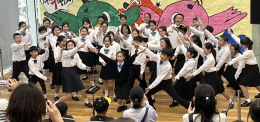 とってもコミカルな曲。、ジジなりのイメージは少し話したが・・・。日本語”アイウエオ・・・ン”の部分や、そうでない歌詞の部分は急な声質やテンポの変化をつけながら笑顔いっぱいで歌っている。指揮は5年生のYさん。ニコニコ顔・・!。身体全体でとても楽しく指揮している。ただ単に4拍子だけでなく,ところどころに自分のイメージを工夫しながら変化させて指揮しているのが素晴らしい。マタマタ驚き・・!。なんと!幼稚園生から大人?位までの声質や歌い方を工夫しながら歌っているではないか!!。勿論、会場は楽しい雰囲気でいっぱい。