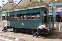 終点の駅での方向変換は2名の若い男性が、手押しでおこないます。これじゃ後継者